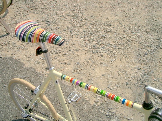 サドル、トップチューブ、チェーンリングガードの3か所に入るストライプ柄。なんとも独創性あふれる素敵なカラーリングにしびれますね。