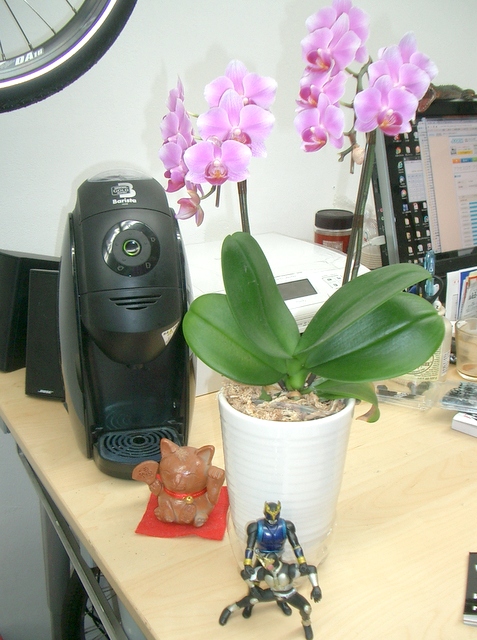 OPEN一周年の記念で頂いた『蘭』。速攻枯らすと思っていましたが、(オープンの時に頂いたのは二週間も持たず・・・)もう二か月たちますが、未だ元気に花咲いています。