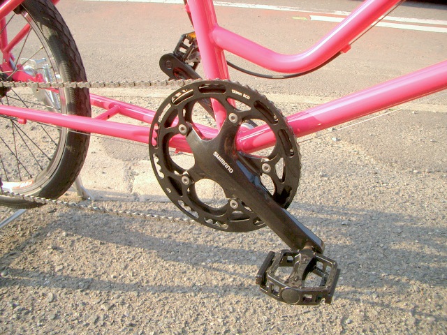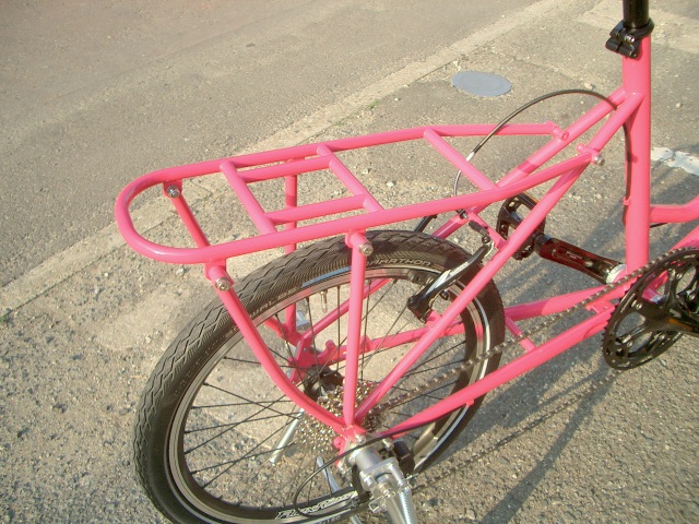 通勤と送り迎えを兼ねたマシーンのご依頼で、基本ご主人が乗りますが、奥様でも乗る事が出来るようにLeaf-Long を選択。ビビットなピンク、フレームが送られてきたときはかなり派手だと思ってましたが、組み上げるととてもいい感じ!ちょっと驚きました。