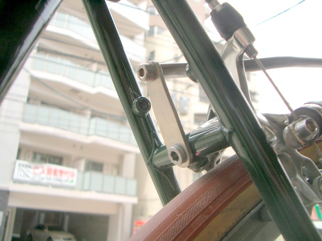 上側はブレーキキャリパーを使ってステーを共締め。なので残念ながらモノステーの自転車には取り付け出来ません。ほら、いきなりそんなでごめんなさい。