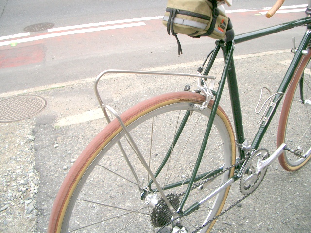 スッキリし過ぎているんじゃないの?というほどさっぱりしたリアキャリア。上に何か乗せるとか、左右にパニアを引っかけるとかそんなもの一切いらない、片側にだけパニアが付けれればそれでいい。必要最低限だけの装備があればいい。という超割り切りの人に丁度いい、そんなやつ。で、これが通勤に丁度良くて、しかも取付けた姿がすっきりしてカッコいいのではないではありませんか。