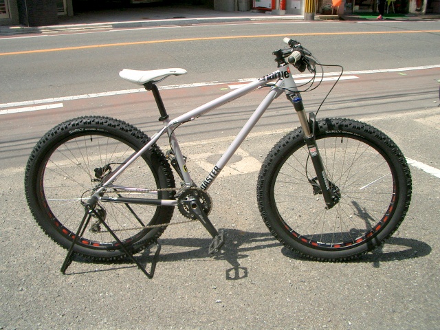 それはTOASTER にSurlyのNewタイヤ、26+のダートウイザードを取り付けてみるという事。フレームを計る限りではなんだか行けそうと思い、仕入れて組み上げて本日前後とも取り付けてみましたよ。