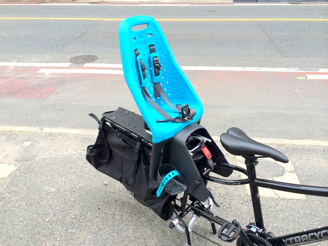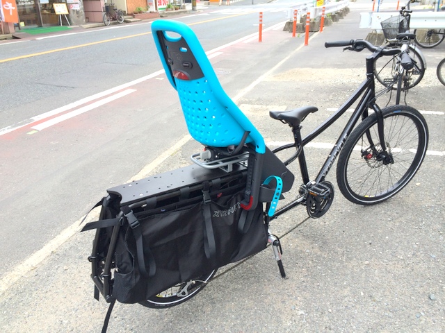 さっきからばっちり見えておりますチャイルドシートはXTRACYCLE 定番のYepp。キャリア取り付け用を選択すれば、無加工ボルトオンで取り付けが可能。本国のメーカーサイトでもYepp の項目がある位で、メーカーでも推奨しているチャイルドシートなのです。