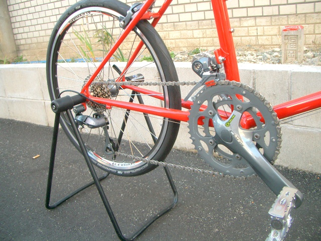 今回のマシーンは見た目&コストを重視。という事でコンポはシマノ クラリスを選択。フロント2枚×リア8枚の16段変速。正直何ら不足ないです。勿論用途を伺った上での選択ですけどね。コンポは用途+ご予算に合わせてご提案致しますよ~。