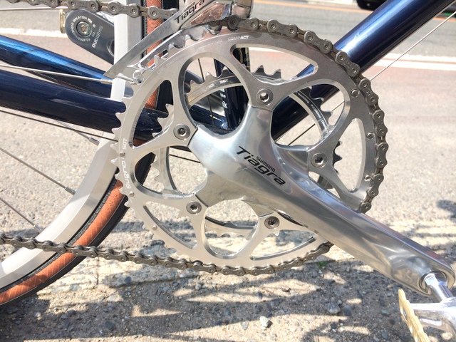 それからもう一カ所。チェーンリングも今回着手しました。元々着いてあるクランクがFC−4600というクランクもチェーンリングも今風のモッタリしたデザイン。そこをぴりっとすべく、チェーンリングをSUGINO PE110のチェーンリングへ変更。しかもハイポリッシュシルバー。クランクはそのままですがノーマルに比べ随分といい感じに生まれ変わりました!!