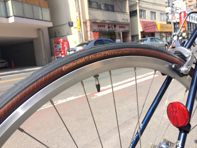 初めてのロードという事で標準装備のスリックタイヤはちと怖い。またクラシックなフレームに合わせたタイヤにしたい!!という事でコンチネンタルのGrand Prix Classic(1本5,100円税別)を装着。見た目の雰囲気の良さと柔らかい優しい乗り心地。クロモリフレームにおすすめのタイヤです!