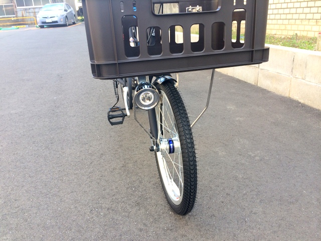 ちゃんとライトステーもバスケット下に良い具合に装着できるようになっており、流石メーカーオプションという所ですね。しかし、これだけデカいカゴがあれば保育園の荷物位なら余裕で運べます! つーかデカすぎで駐輪場が悩むほど(笑)