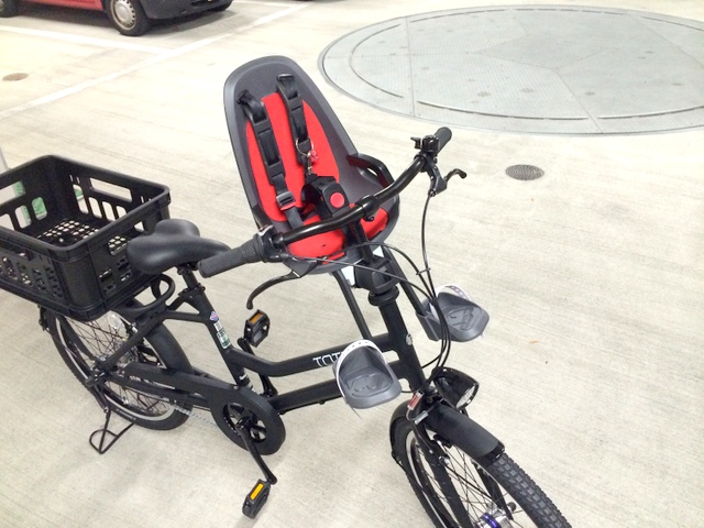 此方は弊店定番のYepp を取り付けたモデル。標準バスケットはリア側につきますが、今回はメーカーオプションを用いてフロント側にバスケットを装着。フロント側に来るとバスケットがめちゃデカい!!