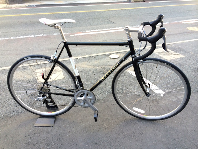 ブラックっぽく見えますが、カラーはクラブグリーン!光の当たり具合で変わるのも良い感じですね。RALEIGH は塗装がしっかりしているので良い艶してます!