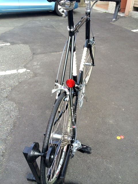 先日ご紹介致しました、CRF のミニベロバージョンです。レイノルズ520クロモリフレームにカーボンフォーク。クランク以外は5800系105で完全武装。クランクは105ではチェンリングの大きさが足りないのでSugino製ですが、その分56Tというデカいチェンリングがついており、小径車ですがメッチャスピードが出ます!!そう、ロードを追い回せる程の能力を秘めているんですよ!! 小さいからって侮るなかれデス。