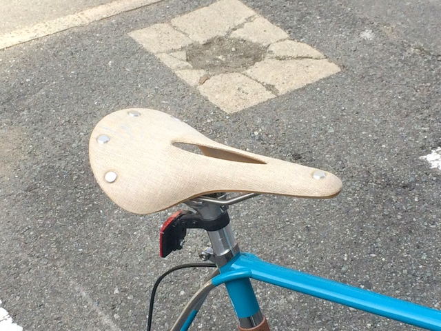 オーナー様は雨の日も通勤でご使用予定という事で、標準装備のBrooks B-17STD から、CAMBIUM C-17 CARVED をセレクト。雨にも負けず、調整もいらず、でも長年使い続けたレザーサドルのような座り心地。ちいとお値段は高いですが、その価値は十二分にあります!最高に素敵でおすすめなサドルの一つですね。