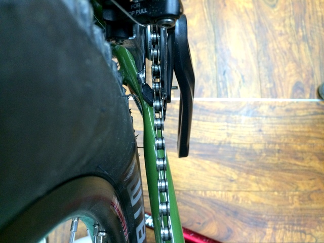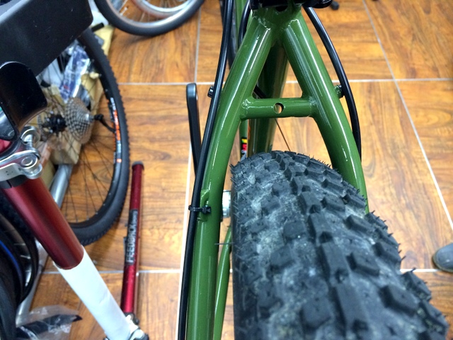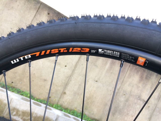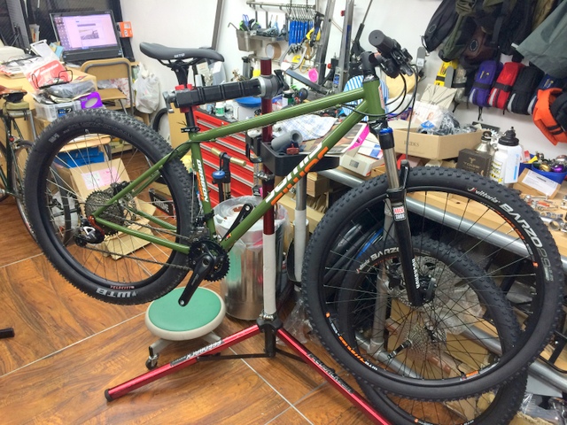 足回りといえば、流行りの27.5+ が入るか試してみました。タイヤはWTB トレイルブレイザー27.5×2.8 リムは35mmリムにて。細身のフレームだったからちと不安でしたが、35mmリムなら全然OK!