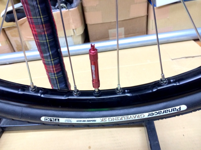 本日届くと思われた、RALEIGH CRTI が届かずなんだか悶々とした一日でした。あの雄姿を一日も早く見たかったのに!!そんな悶々とした中で本日の作業の一部をご紹介です。本日は常連様より愛車のチューブレス化のご依頼を受けましたのでその一コマ。