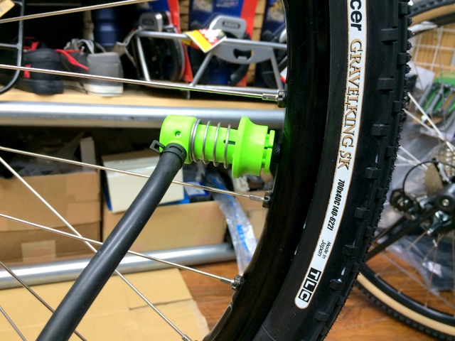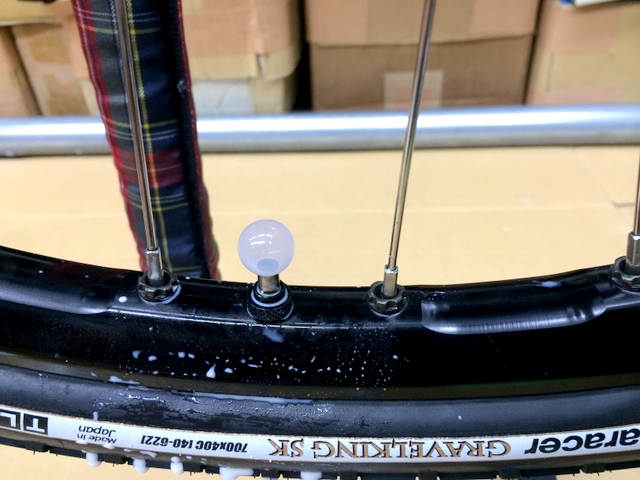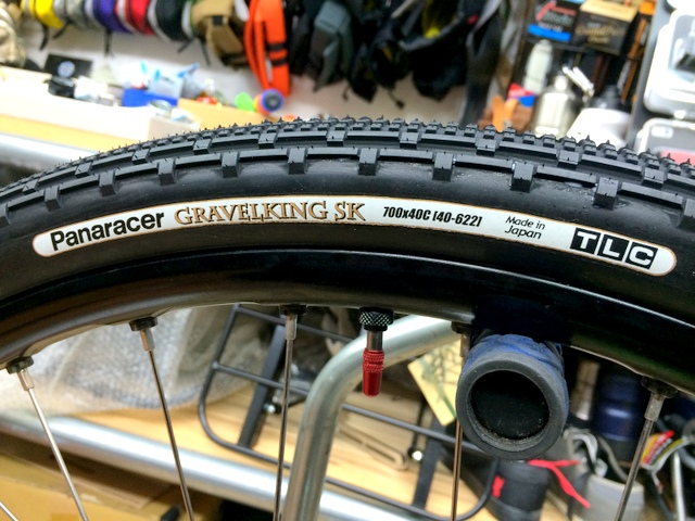 タイヤは新しく発売されたPanaracer グラベルキング 700×40c 。リムは元々MAVICのチューブレスリムを使用していましたからタイヤ、シーラント(は在庫有り)が揃った本日作業決行!
