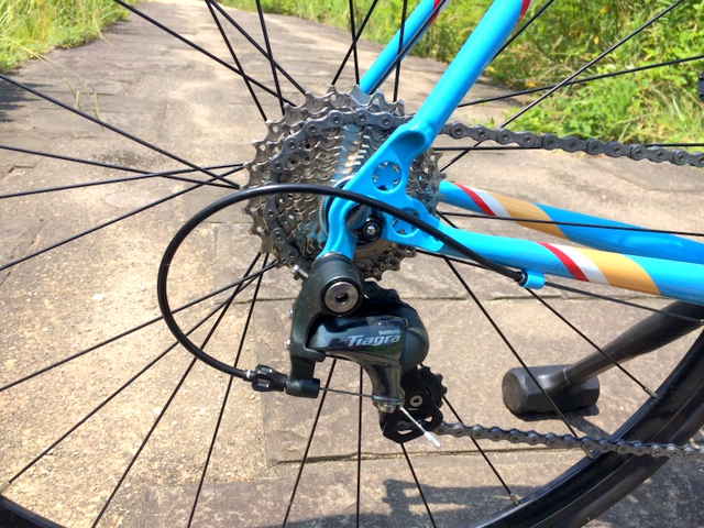 このENVY、FortuneやSPITFIREと違い、リアブレーキはスタンダードな位置にあります。このモデルはTiagraモデルですが、ブレーキはテクトロ。効きはもう少し頑張りましょう。という所です。普通に乗る分には全然問題なしですが、下りやいざという時を考えたのなら、できれば前後ともパワーアップさせたい。。。唯一の残念点です。でも何度も言いますが、問題があるわけではないですからね。ちゃんと止まります、コントロールできますよ!!