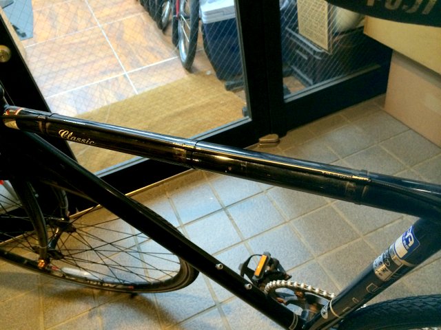 毎日の通勤で使うそうで、タイヤは耐久性を求めシュワルベマラソンへ。お客様のご要望で、ノーマルの25cから28cへとちょっと太くしました。これがギリギリ。結果ハンドルポジションと相まってマイルドな乗り心地。このユル感大好き。