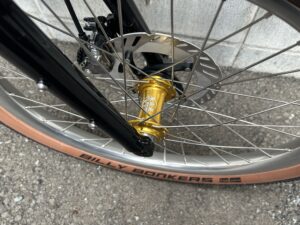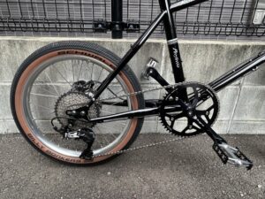 今回はミニベログラベルバイクを作成。オーナー様のご希望でなるべく日本メーカーのパーツとアメリカメーカーのパーツのみで構成。コンポはシマノGRXで1×11速。ミニベロなので大き目なチェンリングを装着するために、クランクは130PCDのものを検討してSuginoクランクに。